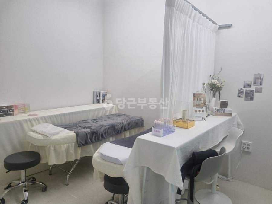 테이블 안쪽에는 베드 2개를 배치할 수 있는 공간과 샤워실이 마련되어 있어 속눈썹, 왁싱 등의 다양한 뷰티 시술이 가능합니다. 또한, 수강실 용도로 만들어진 공간에서는 교육, 회의, 식사 등을 진행할 수 있습니다. 특히 출입문이 분리된 단독 샵 공간과 베드 2개가 추가로 있어, 샵인샵 형태로 월세 수익을 창출하거나 1인 독립 피부관리실 또는 작업실로도 활용할 수 있습니다.
