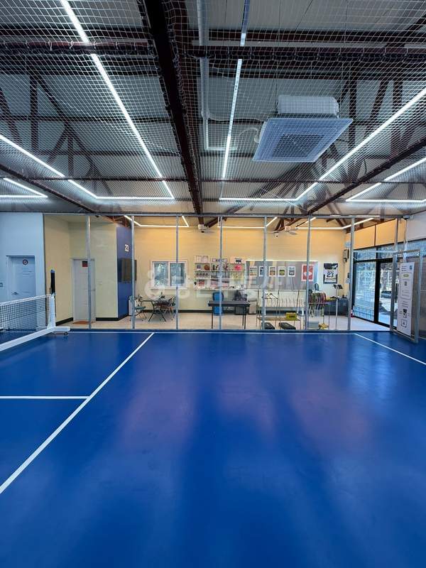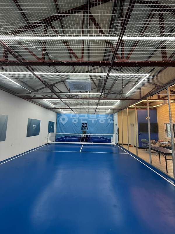 상가 내부의 테니스 코트 바닥 마감 상태와 야외 피클볼 장의 펜스 및 조명 시설을 확인할 수 있는 실사진입니다. 넓은 전용 면적과 특수 설계된 바닥 시설이 완비된 매장의 전경을 참고하시기 바랍니다.