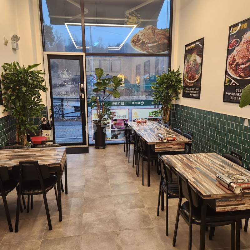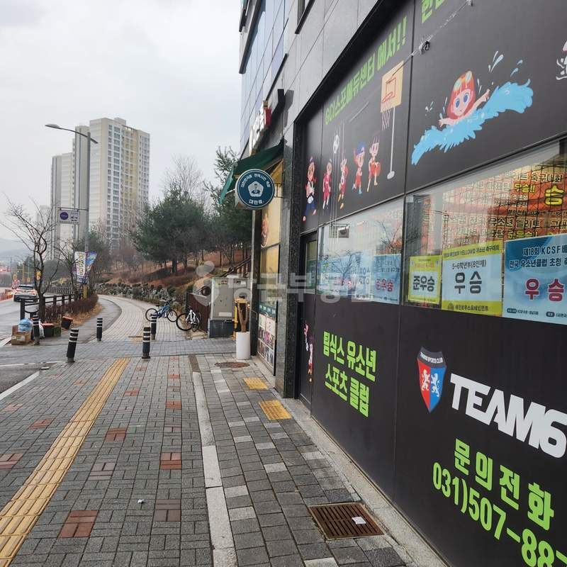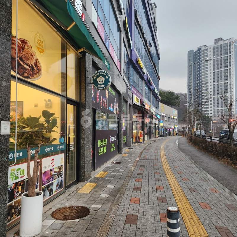관리가 잘 된 매장 내부와 건물 전경을 확인할 수 있는 실사진입니다.